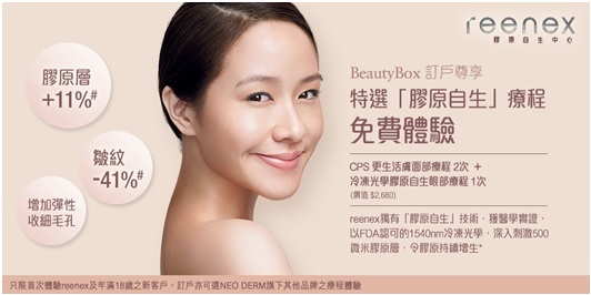 訂戶可以選擇不同的特選醫學美容療程,而當中 reenex「膠原自生」療程是首推介的,Reenex以獨有的「膠原自生」技術,以FDA認可的1540nm冷凍光學,深入刺激500微米膠原層,令膠原持續增生,詳情可參閱︰網址: http://www.reenex.com.hk/