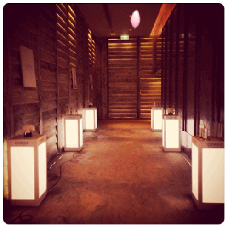 經過長長嘅通道,漆黑中只見一個又一個橙柱,擺放了CLINIQUE 2014年春天的新產品,沿途充滿了一種清新的芳香,最後到達了 CLINIQUE 春日發佈會。