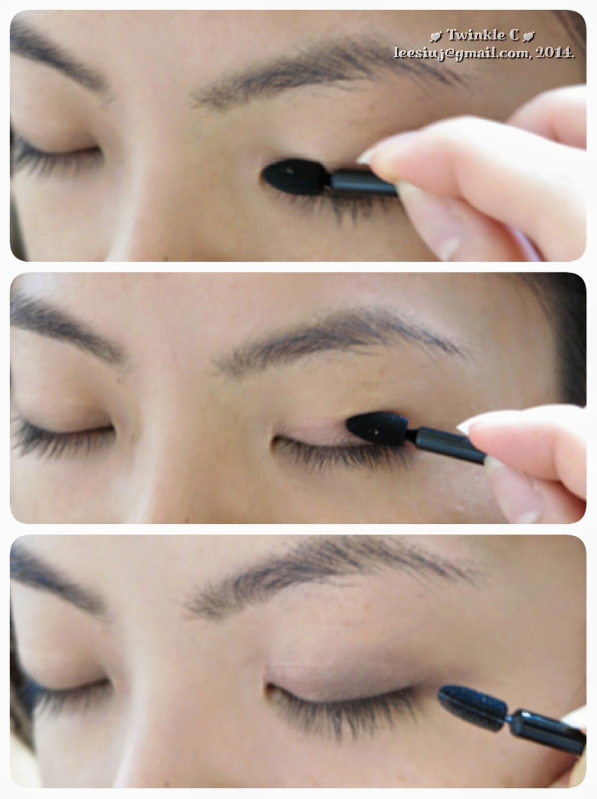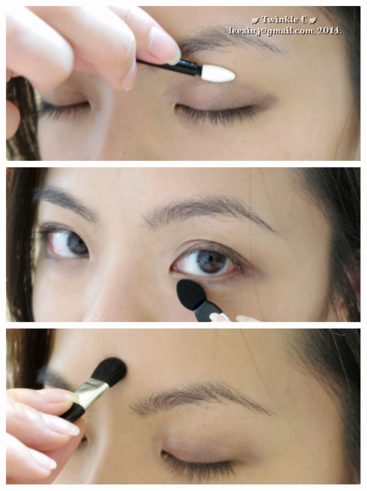 – 先取『粉紅色』眼影,塗抹於眼頭位置,到雙眼皮便夠了,切忌貪心,塗得太高