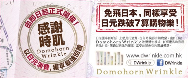 2015年,日元匯率創新低,Domohorn Wrinkle 由7月1日起正式推出:感謝時肌,即使於網上,亦可以日元消費,於www.dwrinkle.com.hk 購買任何產品,均直接用日元結算,無論是新舊客戶,均可以日元滙價享受前所未有的護膚體驗。