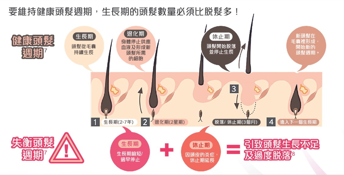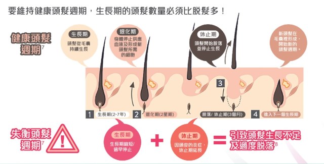 其實頭髮跟皮膚一樣,都有生長週期,以下的圖表就說明了頭髮的生長期,退化期及休止期,懶得研究? 簡單一點,我們必須要維持生長期的頭髮要比脫落的多,才能維持健康的頭髮週期。