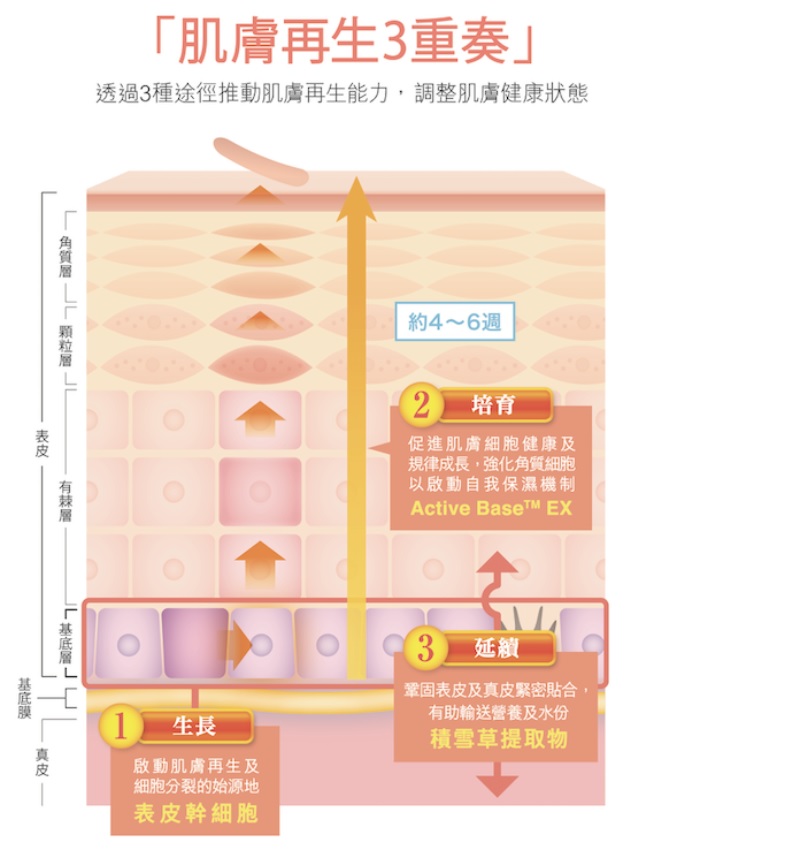 採用 Stem Base α (複合幹細胞配方),幫助推動表皮幹細胞增殖,促進皮膚新陳代謝,加強肌膚的自我再生能力,同時配合Active Base™ EX(高低分子褐藻提取物),幫助啟動天然保濕因子,減少肌膚水份的流失,有效維持肌膚水潤細緻,回復年輕活力的肌感。