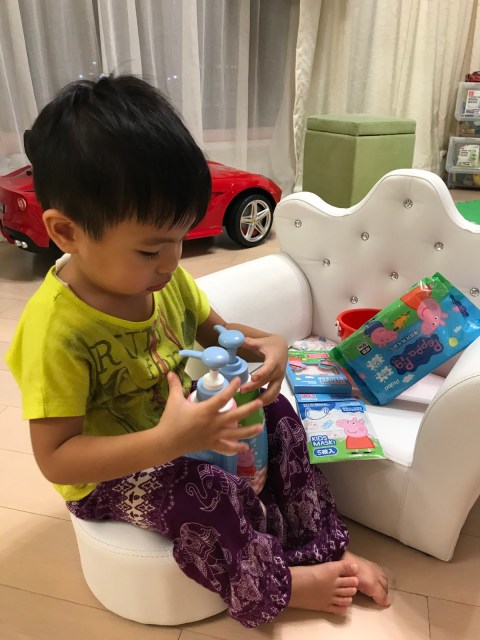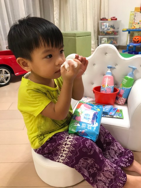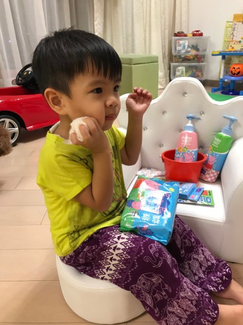 Paris 好似好愛乾淨,其實係扮大人,學我做清潔,一見到 Peppa Pig 純水濕巾,就超級興奮