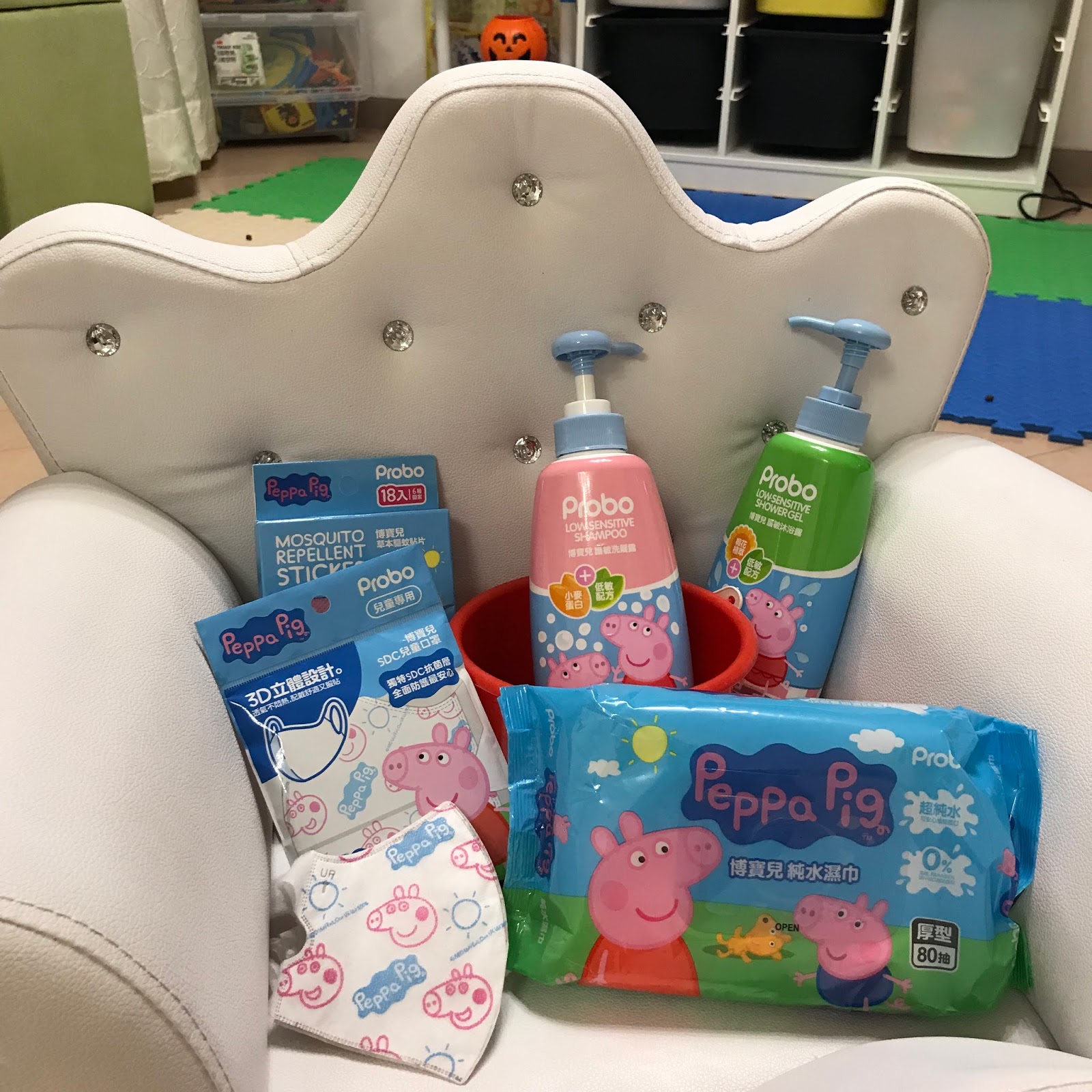 PROBO X PEPPA PIG 個人護理產品系列,包括了護敏洗髮露、護敏沐浴露、護敏泡泡浴、抑菌洗手乳、純水濕巾、抑菌洗手慕絲、SDC 兒童口罩、環保紙軸棉花棒、草本驅蚊貼~