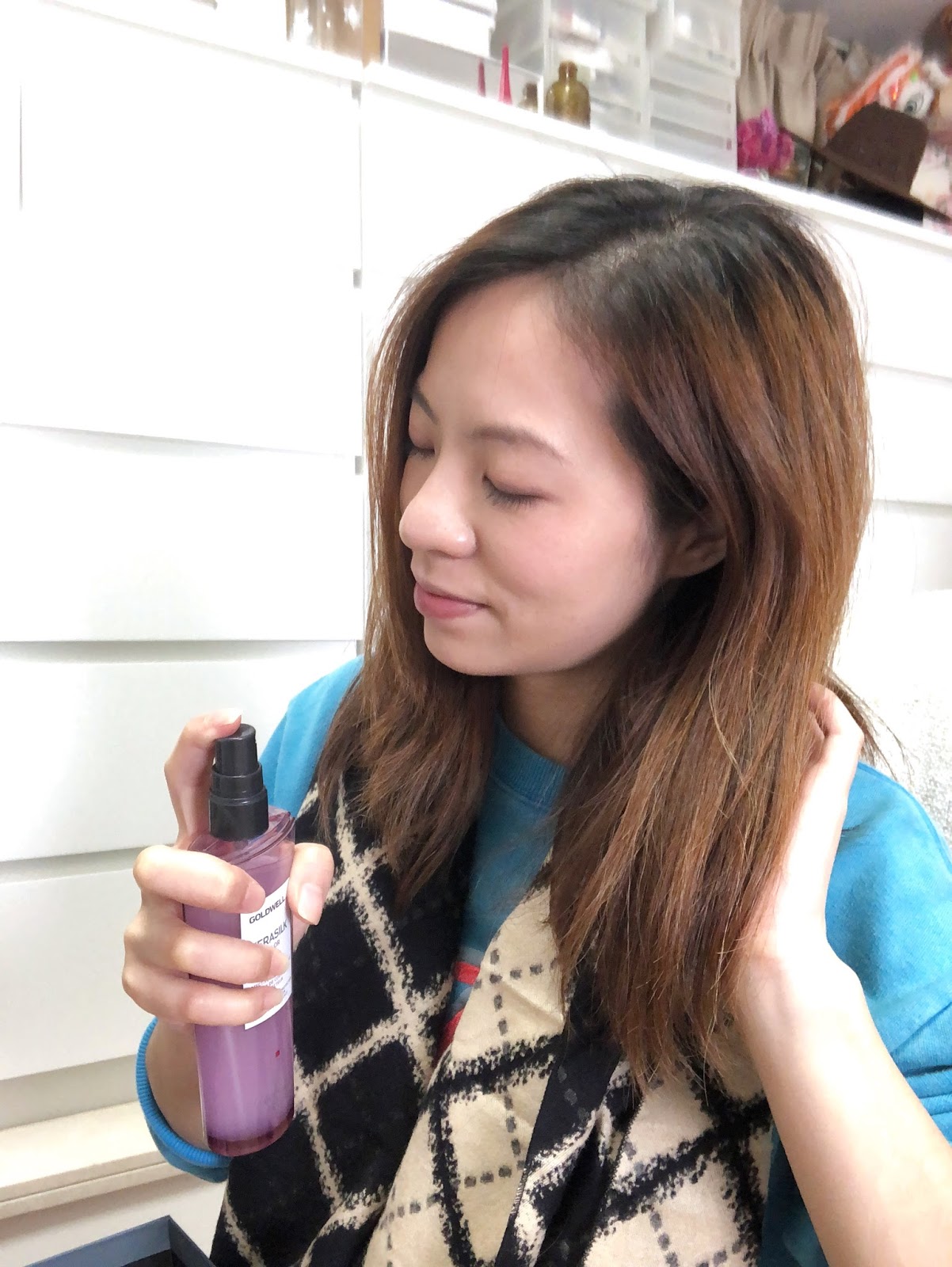 套裝中 Protective Blow-Dry Spray 亮色噴霧,帶有微微的花香及果香,可使用於乾或濕髮上,非常方便,約會前席輕輕噴一下,可以即時回復秀髮的光澤。