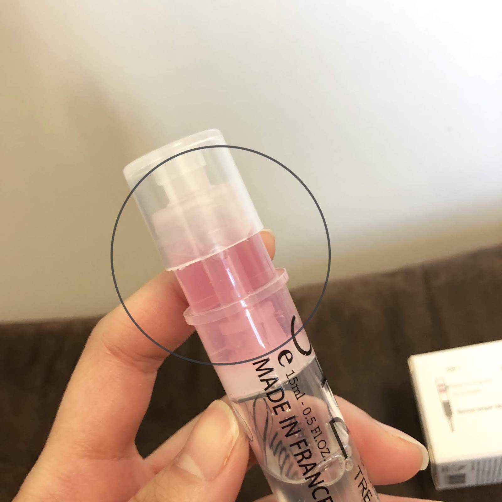 新的精華產品,使用前先撕去膠圈,然後大力按下,上層的粉紅色精華便可以與下層的透明精華液溝合,溝合已經可以備即時使用。