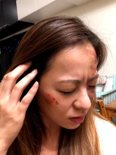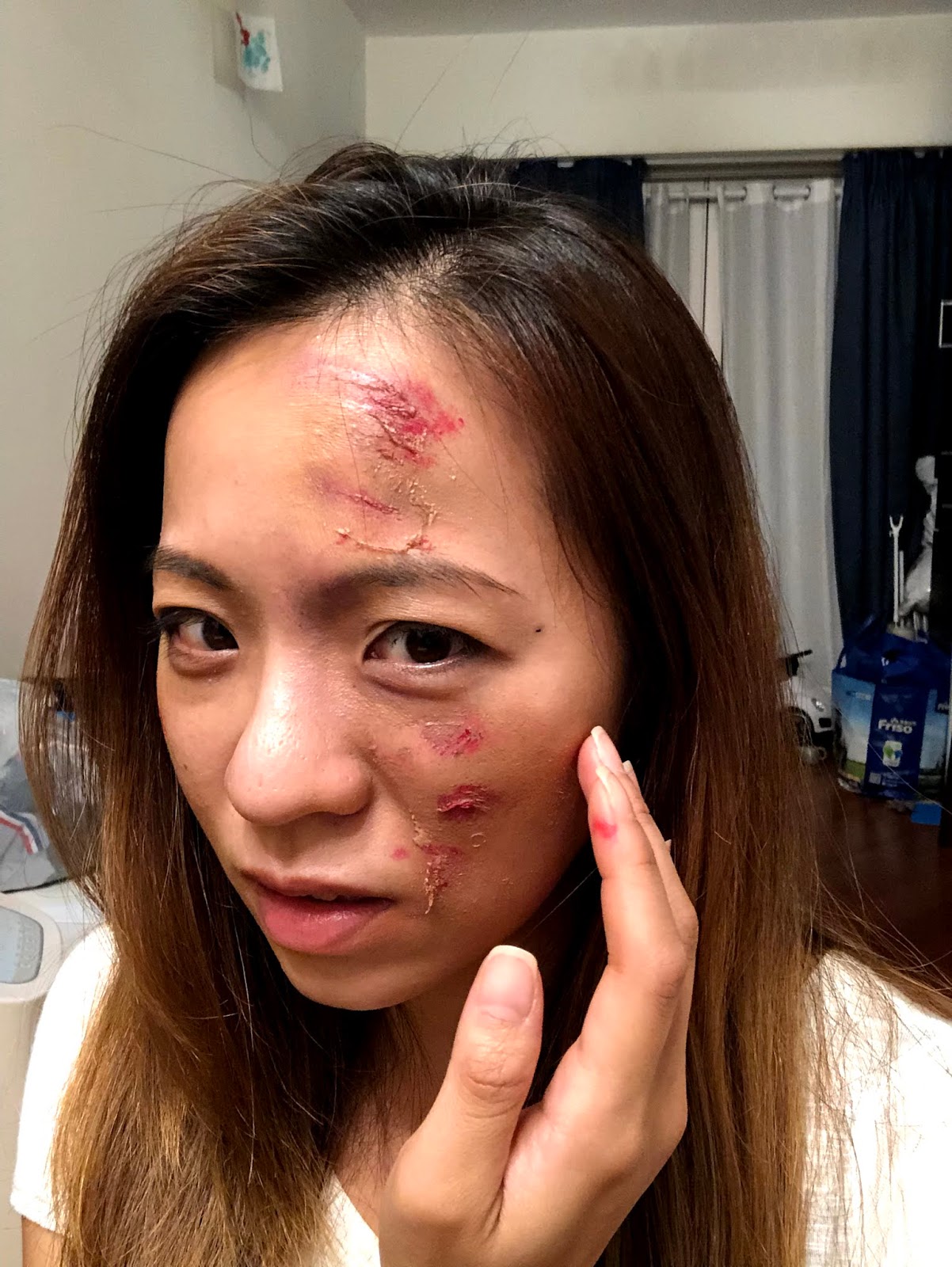 好痛呀,塊面爛哂,一定係俾衰人追到跌落地整親!